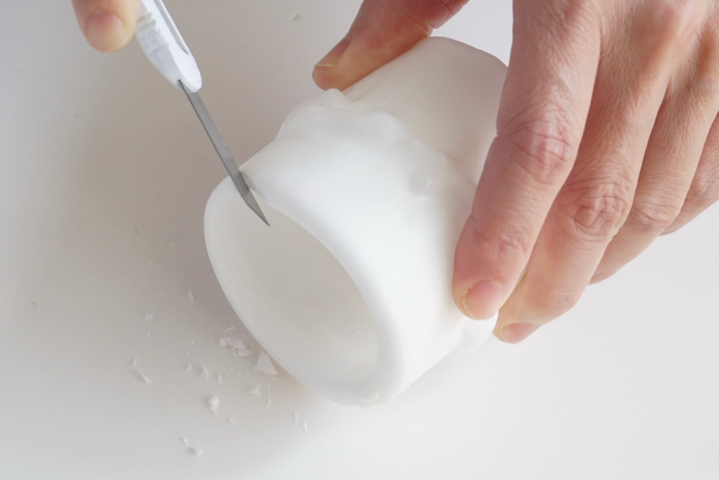上記の方法を試しても炎が消え入りそうなままの場合は、一度火を消して液状の蝋を捨ててから、周囲の壁の一部をカッターでカットして下さい。カットする際は、壁の厚みが薄い部分をカットするようにして下さい。(壁の厚みがある部分を無理にカッターでカットすることは危ないのでお控え下さい。)その後、芯の長さを3〜4mm程度にカットし、再度点火して灯りをお楽しみ下さい。